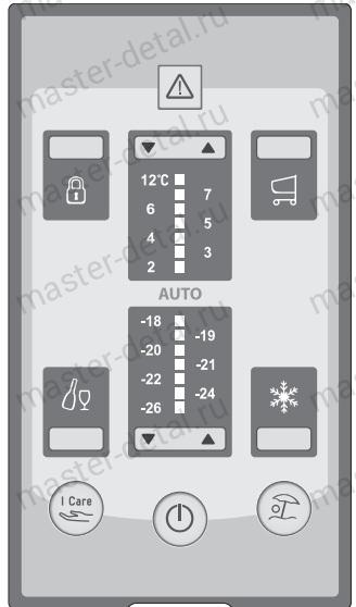 - Для включения устройства нажмите кнопку ‘ON/OFF’: зеленый СВЕТОДИОД указывает, продукт включен - Выключите устройство, затем нажмите кнопку ‘ON/OFF: красный LED указывает, продукт выключен - Если активны функции " I care’ или ‘Holiday’, прошло 10 минут с момента последней взаимодействие с клиентами, дисплей переходит в режим экономии энергии: по указателям температуры с помощью светящихся полос исчезают и остается горит только зеленый СВЕТОДИОД ON. Для включения дисплея достаточно нажмите кнопку или открыть дверь холодильника. - Дисплей на изделии может отличаться от иллюстрации, приведенной выше |