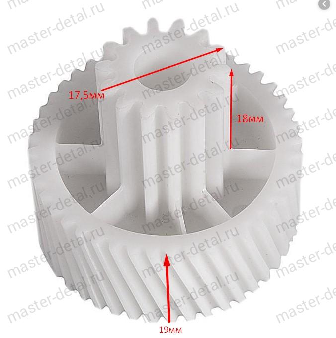 Шестерня ведущая первая от мотора Размеры: Диаметры - 41,5 / 17,5мм, Высота 19 / 18мм, Зубья - 50 шт. косые / 11 шт. прямые. |