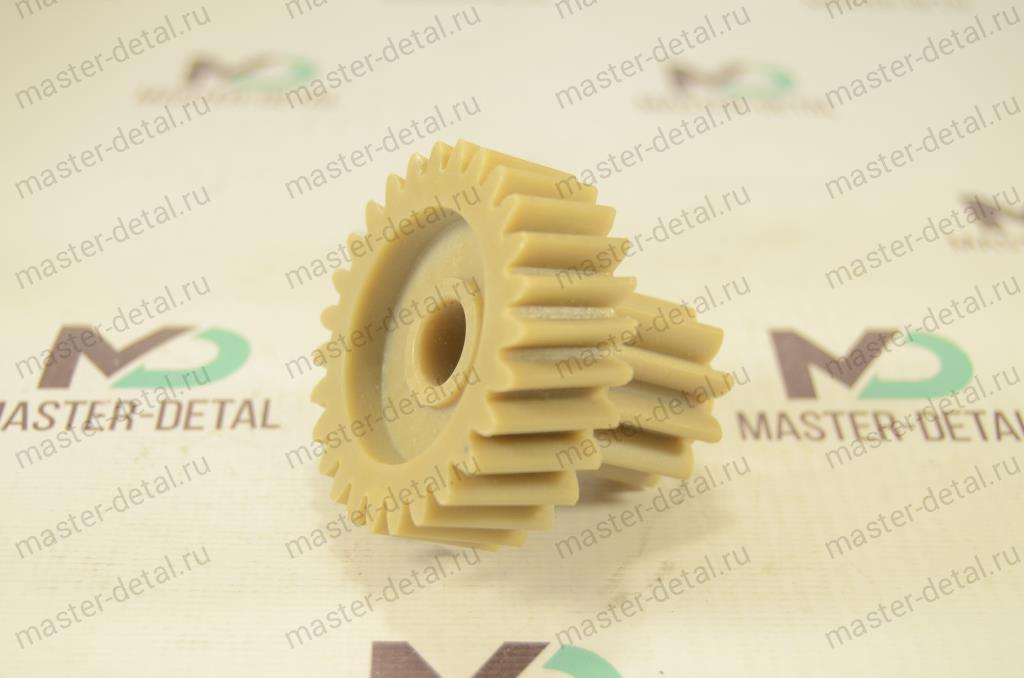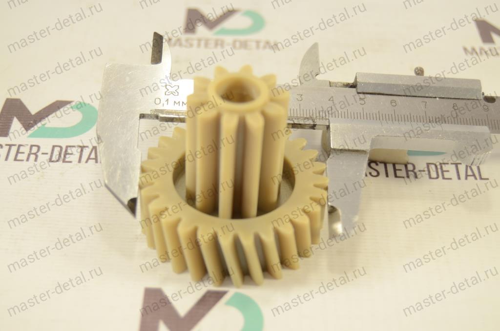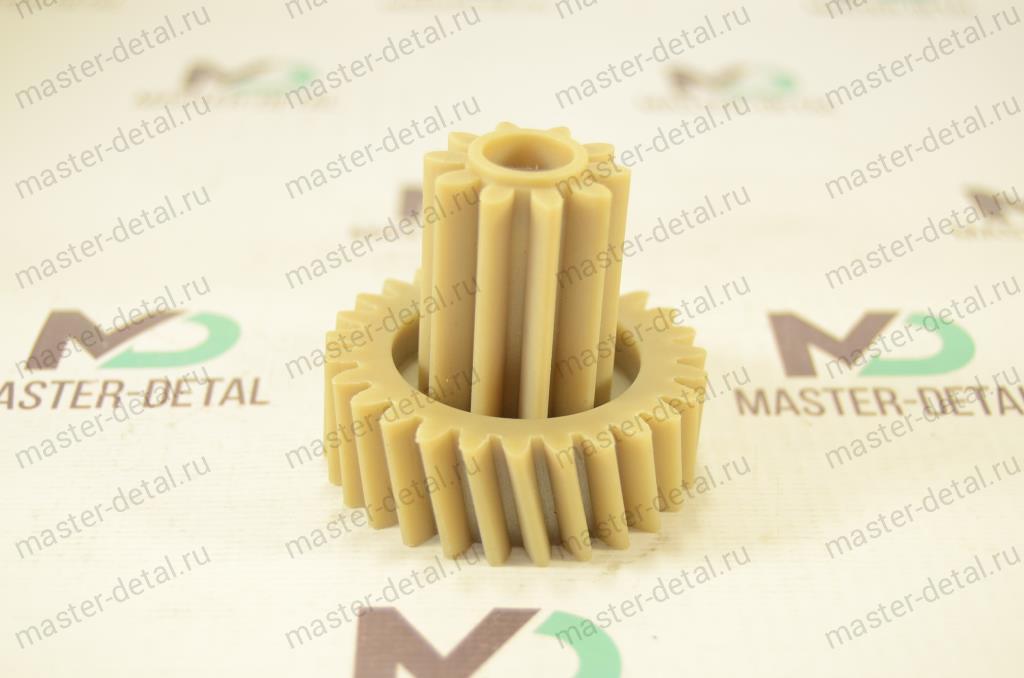 Большая шестерня: Наружный диаметр большой (косые зубья)- 55мм. Высота большей окружности (косые зубья) - 18мм. Диаметр прямых зубцов - 28мм. Высота прямых зубьев - 30мм. Общая высота - 49 мм. Отверстие под вал - 12,5мм. Шестерни могут быть как белого так и цвета охра. |