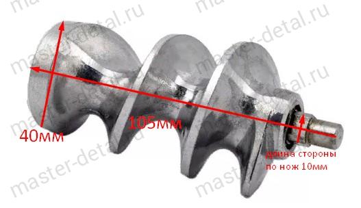 Размеры: Общая длина шнека (без предохранительной втулки) - 105мм, Длина тела шнека - 94мм, Квадрат под нож - 10мм, Длина вала места под нож - 5мм, Диаметр вала под решетку - 8,5мм, Квадрат под предохранитель шнека - 15мм (с резьбой М4 для крепления втулки) |
