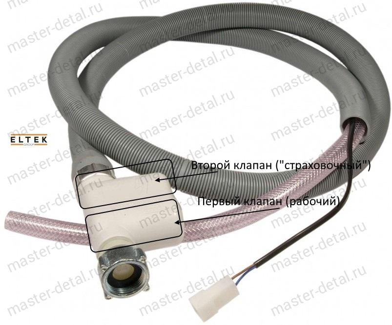 Высококачественный шланг залива воды с аквастопом от итальянской компании Eltek Inc. Имеет два! клапана для более надежной защиты от протечек (см.фото). Может быть установлен на любую марку и модель посудомоечных машин (принцип всех аквастопов идентичен!)