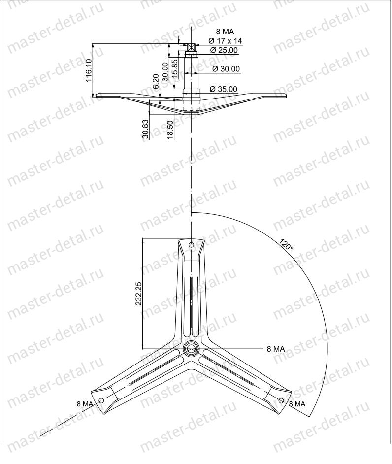 Размеры: Диаметр коренного подшипника - 30мм, Диаметр второго подшипника - 25мм, Диаметр втулки под сальник - 35мм, Крепление шкива болтом - М8 17x14, Общая высота вала - 116мм. |