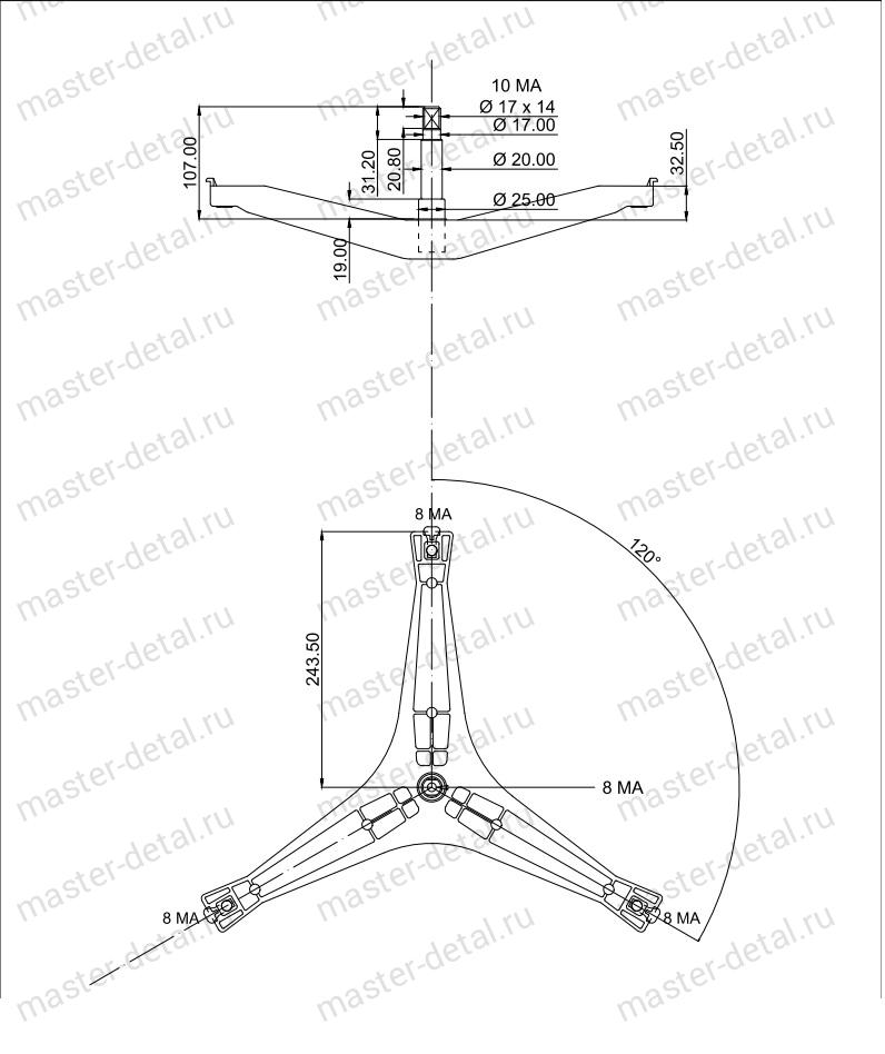 Опора устанавливается на серии: Eco Bubble (Эко Бабл) Crystal Slim (Кристал Слим) Diamond (Даймонд, Диамонд) - модели с загрузкой 3,5 кг, 4 кг, 4,5 кг, 5 кг. Основные размеры крестовины DC97-15182A: Диаметр под внутренний подшипник (ближе к сальнику) - 20 мм; Диаметр под наружный подшипник (дальше от сальника) - 17 мм; Диаметр втулки под сальник - 25 мм; Расстояние между подшипниками - 57 мм; Полная длина вала - 107 мм; Крепление шкива - болт М10; Расстояние от оси вала до оси крепления барабана - 249 мм |