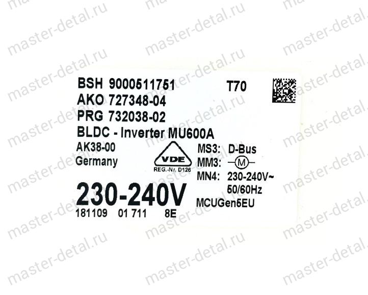 | Надпись - Маркировка | BSH 900511751, AKO 727348-04 (может быть 03), PRG 732038-02 (может быть 01), BLDC Inverter MU600A, AK38-00 |