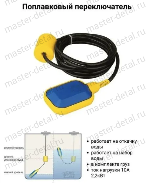 Простое и эффективное управление: работает на принципе перемещения поплавка по уровню жидкости, обеспечивая точное и своевременное срабатывание без дополнительных сложных настроек. Высокая степень влагозащиты IP68: устройство можно погружать в воду, при этом оно защищено от пыли и влаги, что гарантирует долговечность и стабильную работу. Универсальные параметры работы: рассчитан на напряжение 220В/50Гц и максимальную температуру жидкости до +40°С, что оптимально для бытовых и небольших промышленных систем. |
