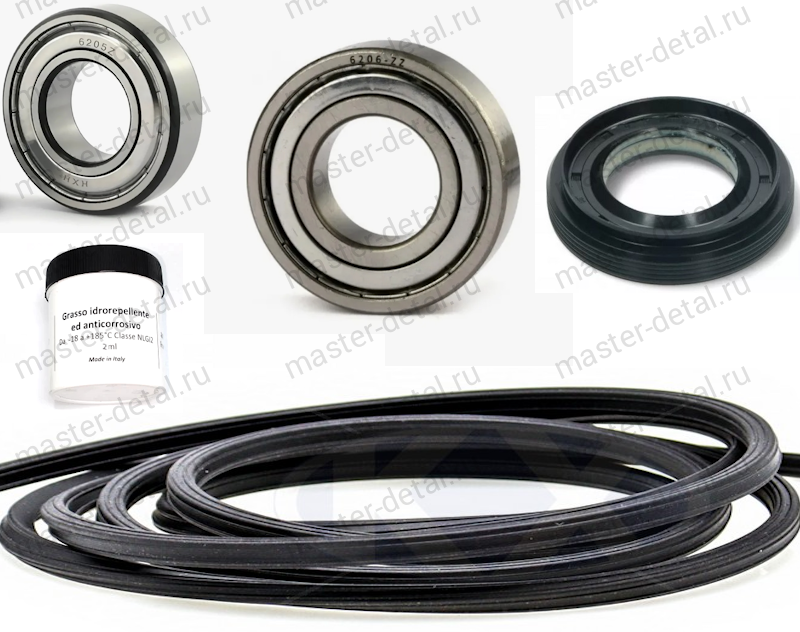 1) Подшипник 6 206 2Z (закрытый, "передний" - рядом с сальником). 2) Подшипник 6 205 2Z (закрытый, "задний" - второй от сальника). 3) Сальник производства NQK маркировкой 37x66x9/12.5. 4) Оригинальная специализированная смазка "Hydra-2" для защитных армированных манжет (сальников) стиральных машин. Производство ANDEROL made in Italy. Поставляется с комплектом в шприце объемом 1,5 мл. Влагоотталкивающие свойства и отличные характеристики температурной устойчивости (до 190С не течет) в сочетании с оптимальными показателями вязкости надежно изолируют манжетную защиту подшипников от воздействия влаги. Температурный порог до +185°C позволяет смазывающим компонентам сохранять свои свойства при нагревании. 5) Уплотнителем половинок бака! |