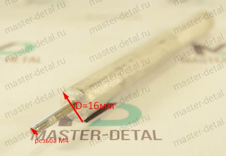 Размеры анода длина части из магниевого сплава - 140мм; диаметр части из магниевого сплава - 16мм; длина шпильки с резьбой - 20 мм; тип крепления - резьба M4. |