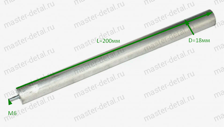 Размеры: Длина части из магниевого сплава - 200мм (20 см.!) - ресурс минимум 3 года! Диаметр стержня - 18мм. Длина шпильки с резьбой - 10мм. Крепление - резьба M6 (6 мм). Может быть установлен в любой обогреватель воды с резьбой 6мм (М6). |