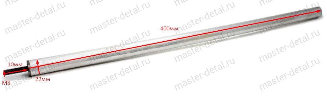 Размеры анода: Длина части из магниевого сплава - 400мм; Диаметр части из магниевого сплава - 22мм; Длина шпильки с резьбой - 10мм, Крепление - резьба М8. |